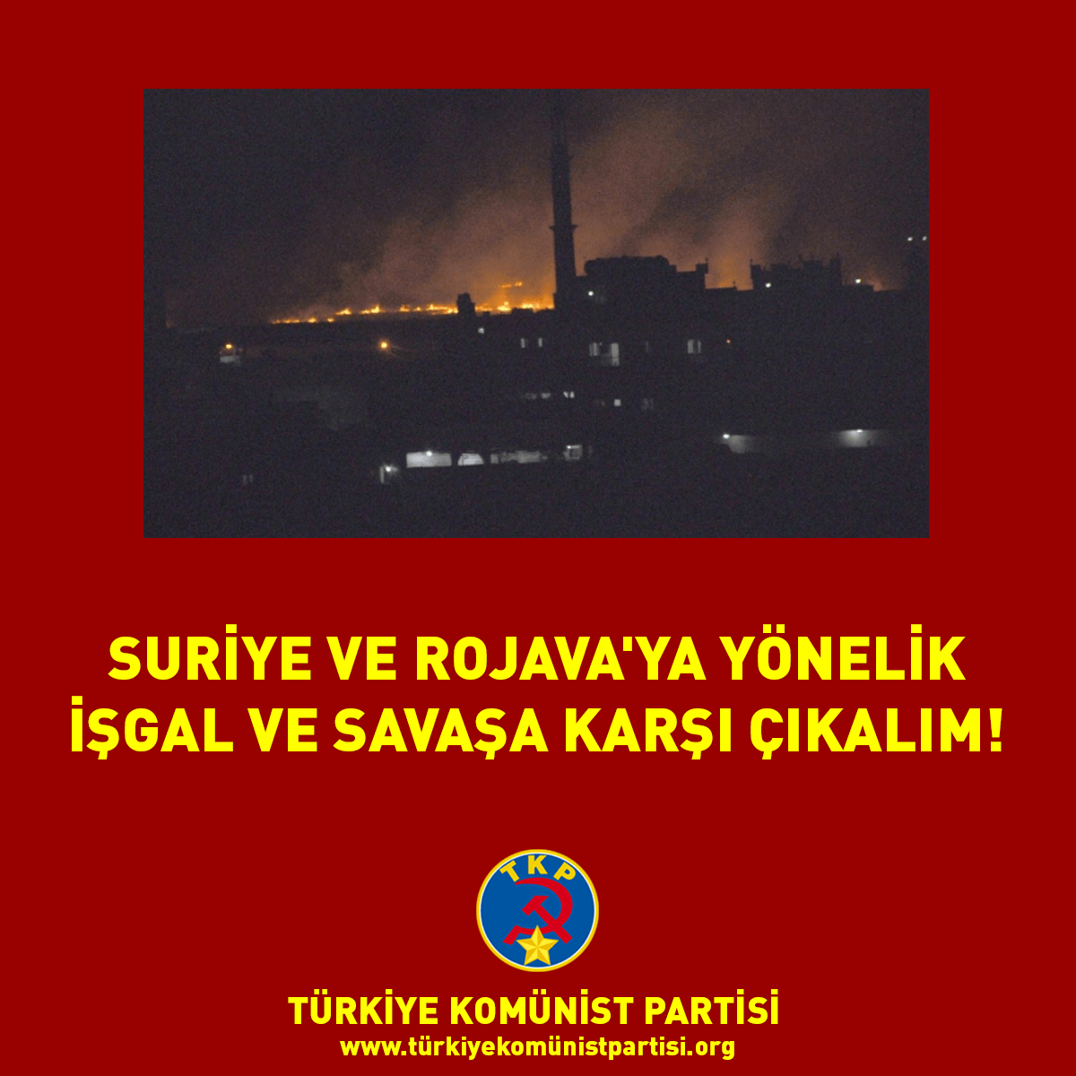 Türkiye’nin tüm barış ve demokrasi güçlerini savaşa ve işgale karşı seslerini yükseltmeye ve fiilen harekete geçmeye çağırıyoruz. Suriye silahlı kuvvetlerini, Suriye Demokratik Güçleri’ni direnişi ve saldırıyı geri püskürtmeye çağırıyoruz. Rojava’da oluşan enternasyonal demokratik savunma güçleri bu savaşta emsalsiz kahramanlıklar sergileyeceklerdir, onlarla sınırsız dayanışmamızı ilan ediyoruz.